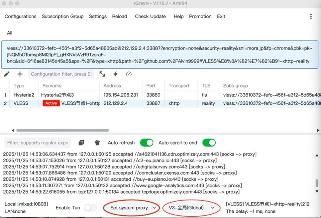 在v2rayN 屏幕下方代理 Proxy选项中选 “Set system proxy”,在其隔壁右边V3选项中选 “V3-全局 (Global)”:
